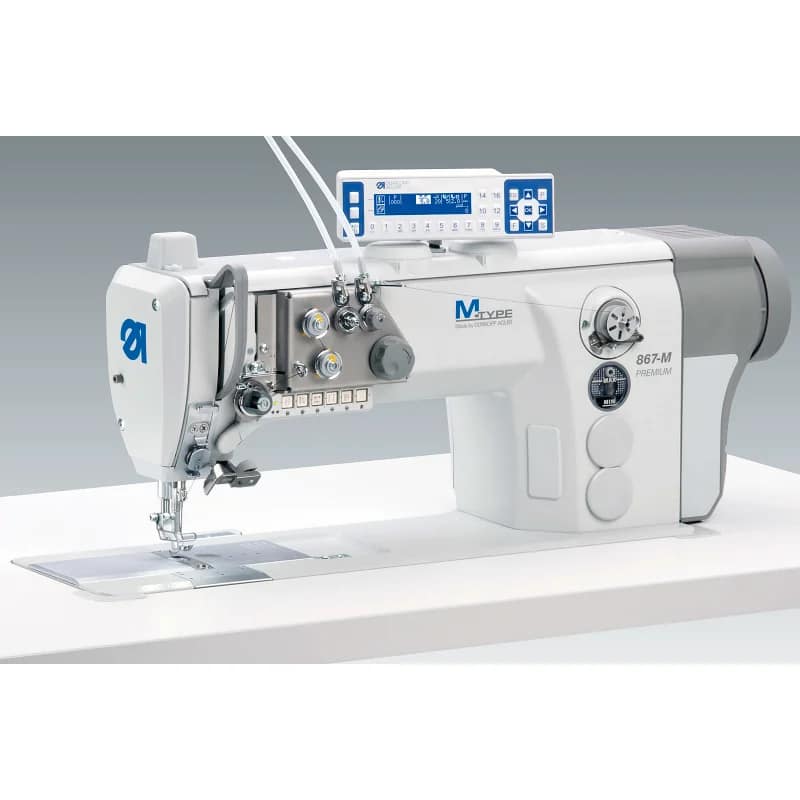 TIP M 867-M PREMIUM – jednoigleni industrijski šivaći stroj za ravno šivanje – šteperica (vrsta boda 301) s kratkim ostatkom konca, DA Direct Drive pogonom, XXL vertikalnim dvodijelnim grajferom, automatskim funkcijama i trostrukim transportom za srednje teške do teške materijale