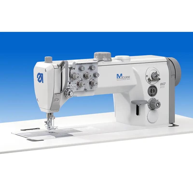 TIP M 867 ECO – dvoigleni industrijski šivaći stroj za ravno šivanje – šteperica (vrsta boda 301) s velikim vertikalnim dvodijelnim grajferom i trostrukim transportom za srednje teške do teške materijale
