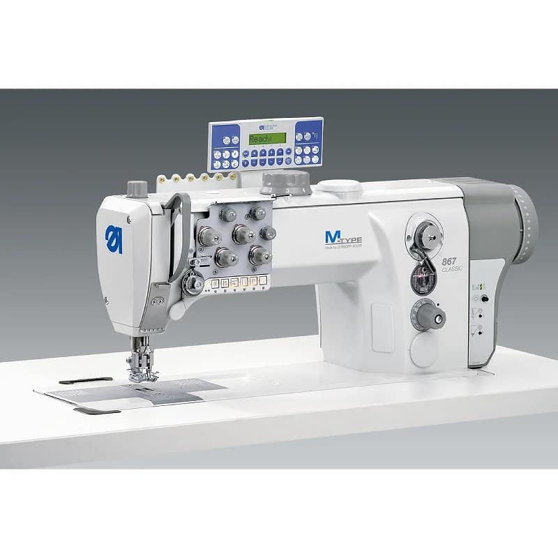 TIP M 867-M CLASSIC Silverline – dvoigleni industrijski šivaći stroj za ravno šivanje – šteperica (vrsta boda 301) s DA Direct Drive pogonom, XXL vertikalnim dvodijelnim grajferima, automatskim funkcijama i trostrukim transportom za srednje teške do teške materijale