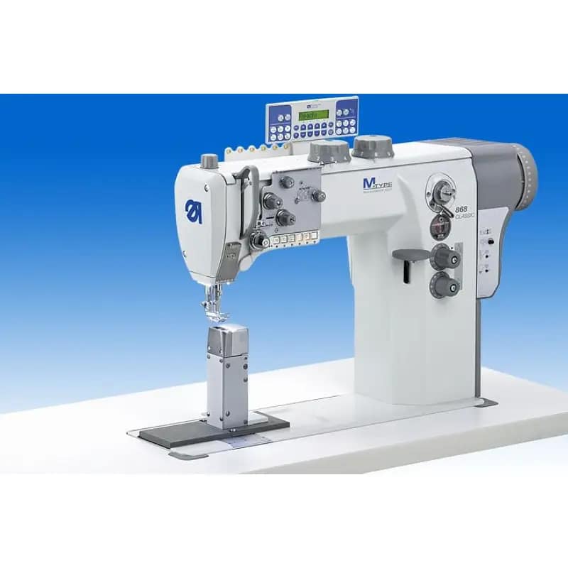 TIP M 868-M CLASSIC Goldline – jednoigleni industrijski stubni stroj za ravno šivanje (desni stub, vrsta boda 301) s DA Direct Drive pogonom, velikim vertikalnim dvodijelnim grajferom, trostrukim transportom i automatskim funkcijama za srednje teške do teške materijale