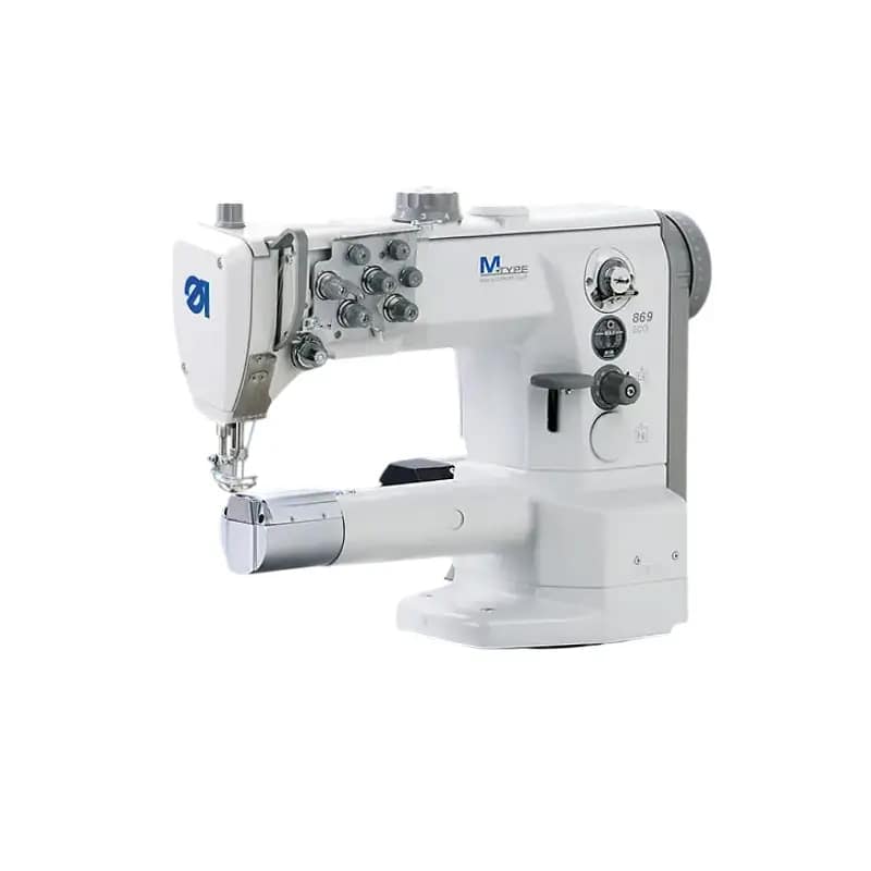 TIP M 869 ECO – dvoigleni industrijski šivaći stroj za ravni bod (vrsta boda 301) s cilindričnim ležajem, velikim vertikalnim dvodijelnim grajferima i trostrukim transportom za srednje teške do teške materijale
