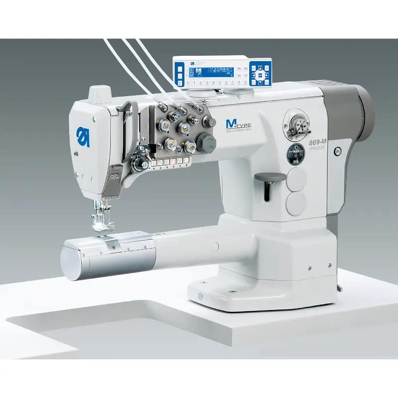 TIP M 869-M PREMIUM – dvoigleni industrijski šivaći stroj za ravni bod (vrsta boda 301) s cilindričnim ležajem, DA Direct Drive pogonom, velikim vertikalnim dvodijelnim grajferima, trostrukim transportom i automatskim funkcijama za srednje teške do teške materijale