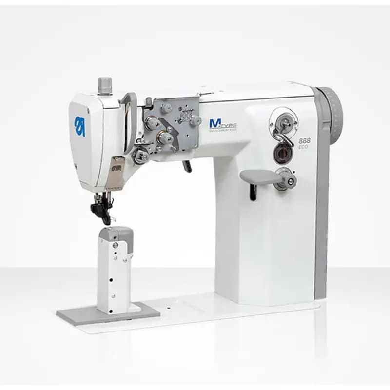 TIP M 888 ECO – jednoigleni industrijski stubni stroj za ravno šivanje – šteperica (desni stub, vrsta boda 301) s transportom kotačićem, iglenim transportom i transportom gornjim pogonskim valjkom, velikim vertikalnim dvodijelnim grajferom za lagane do teške materijale