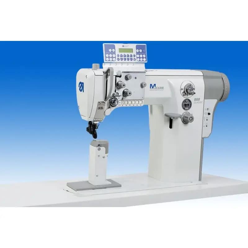 TIP M 888-M CLASSIC Silverline – jednoigleni industrijski stubni stroj za ravno šivanje – šteperica (desni stub, vrsta boda 301) s DA Direct Drive pogonom, transportom kotačićem, iglenim transportom i transportom gornjim pogonskim valjkom, automatskim funkcijama i velikim vertikalnim dvodijelnim grajferom za lagane do teške materijale