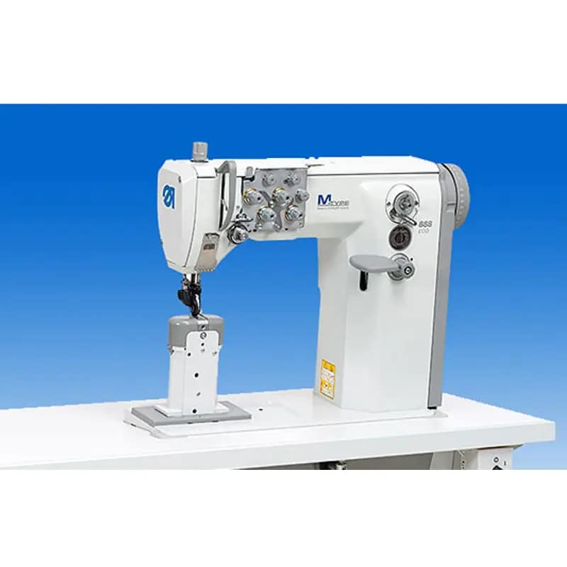 TIP M 888 ECO – dvoigleni industrijski stubni stroj za ravno šivanje – šteperica (vrsta boda 301) s transportom kotačićem, iglenim transportom i transportom gornjim pogonskim valjkom, velikim vertikalnim dvodijelnim grajferom za lagane do teške materijale