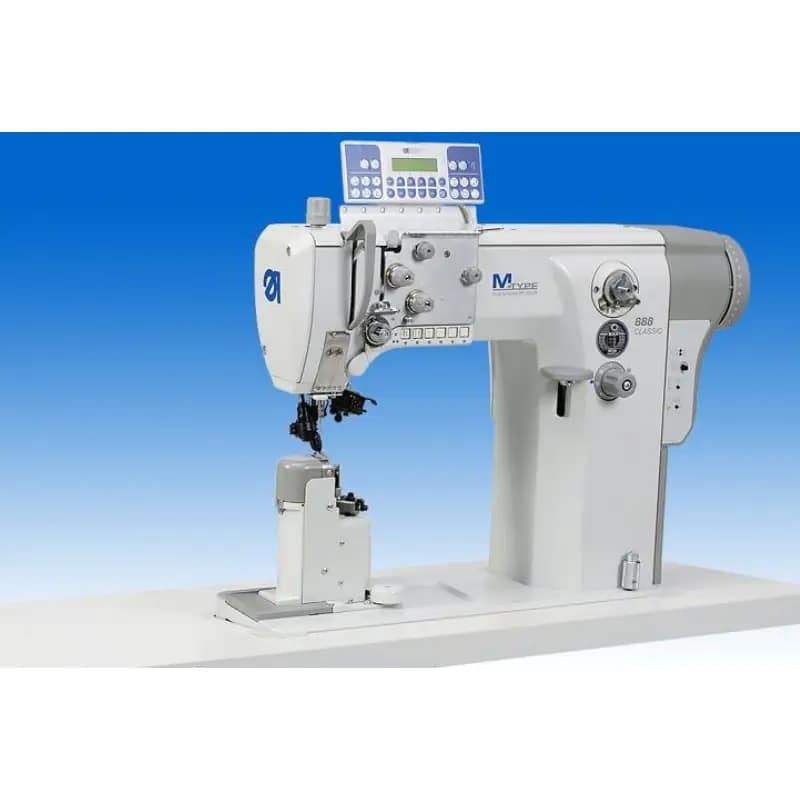 TIP M 888-M CLASSIC Silverline – jednoigleni industrijski stubni stroj za ravno šivanje – šteperica (lijevi stub, vrsta boda 301) s DA Direct Drive pogonom, transportom kotačićem, iglenim transportom i transportom gornjim pogonskim valjkom, automatskim funkcijama i velikim vertikalnim dvodijelnim grajferom za lagane do teške materijale