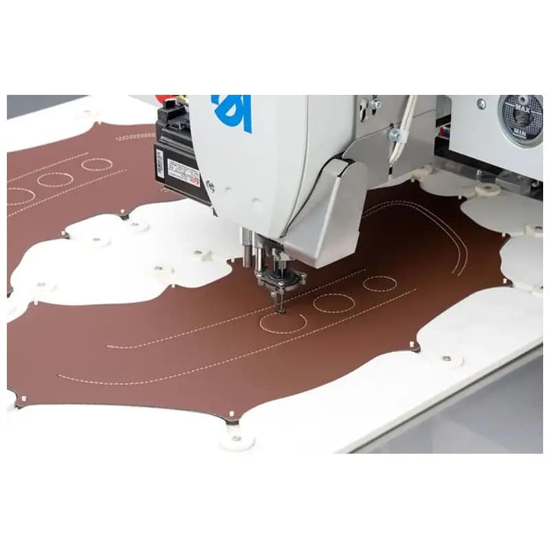 Računalno (CNC) upravljana šivaća jedinica s ravnim bodom (vrsta boda 301), rotirajućom iglenjačom, grajferom i papučicom, XXL vertikalnim grajferom i radnim područjem do 600 × 200 mm za slobodno programabilne operacije šivanja na srednje teškim do teškim materijalima