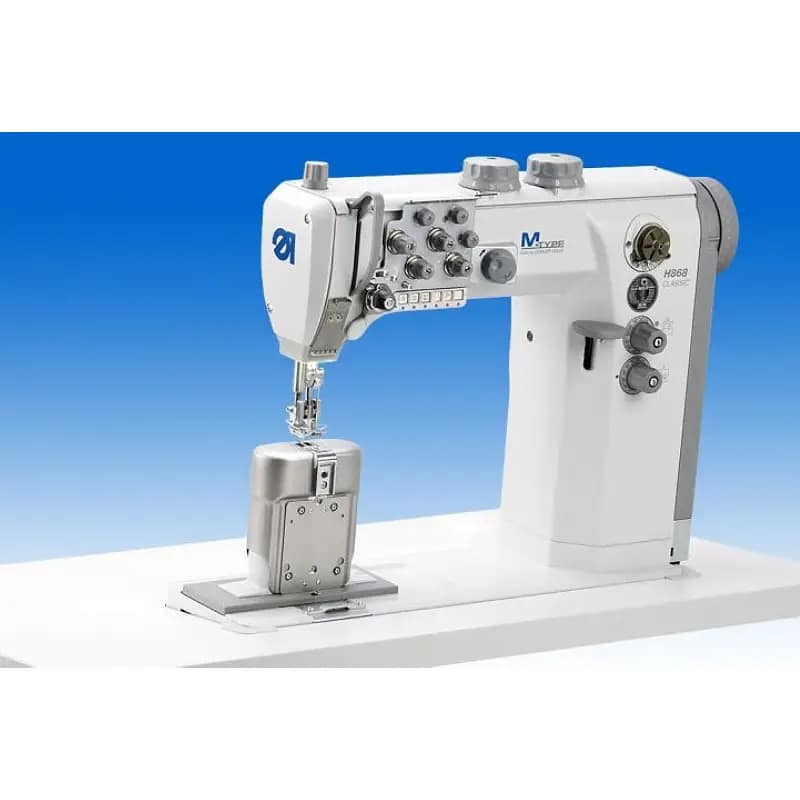 TIP M H868 CLASSIC Goldline – dvoigleni industrijski stubni stroj za ravno šivanje (vrsta boda 301) u ojačanoj verziji s 3XL vertikalnim dvodijelnim grajferima, trostrukim transportom i automatskim funkcijama za srednje teške do teške materijale