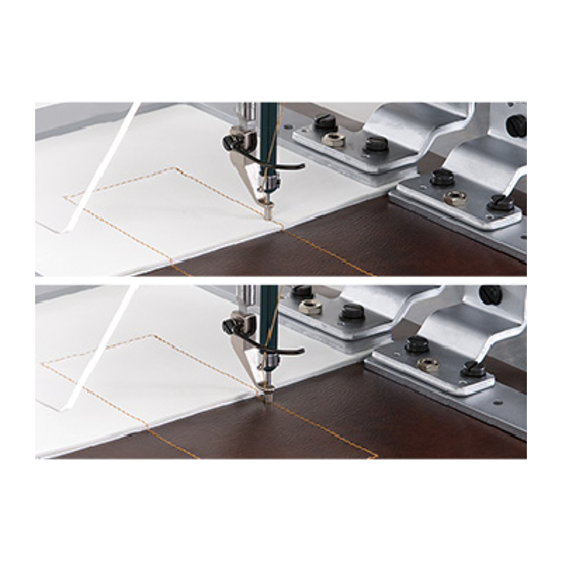 Kako bi se podržalo šivanje višeslojnih dijelova materijala, visina donje mrtve točke prihvatne papučice može se bezstupanjsko mijenjati tijekom šivanja (standardno: 0 – 3,5 mm; maksimalno: 0 – 7,0 mm). Prihvatna papučica moći će stegnuti materijal bez greške, čime će se spriječiti problemi u šivanju, poput preskakanja boda i kidanja konca. Nadalje, nedostaci na proizvodu za šivanje spriječeni su održavanjem srednje visine po želji u skladu s debljinom materijala. (Međuhod prihvatne papučice podesiv je između 0 i 10 mm.)