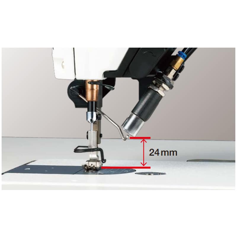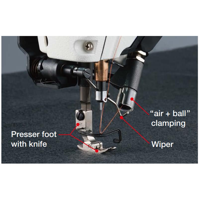 • Na kraju šivanja na materijalu ostaje konac od samo 3 mm duljine. Stroj usvaja novu metodu podrezivanja konca pri čemu novorazvijeni mehanizam za podrezivanje konca podrezuje konac izravno ispod ubodne ploče, dok se zadnji šav (ili dva šava) na kraju šivanja šiva s manjom duljinom šava s pomoću zgusnutog šava. Kao rezultat toga, duljina konca koja ostaje na materijalu skraćena je, čime se eliminira rad na rezanju konca.