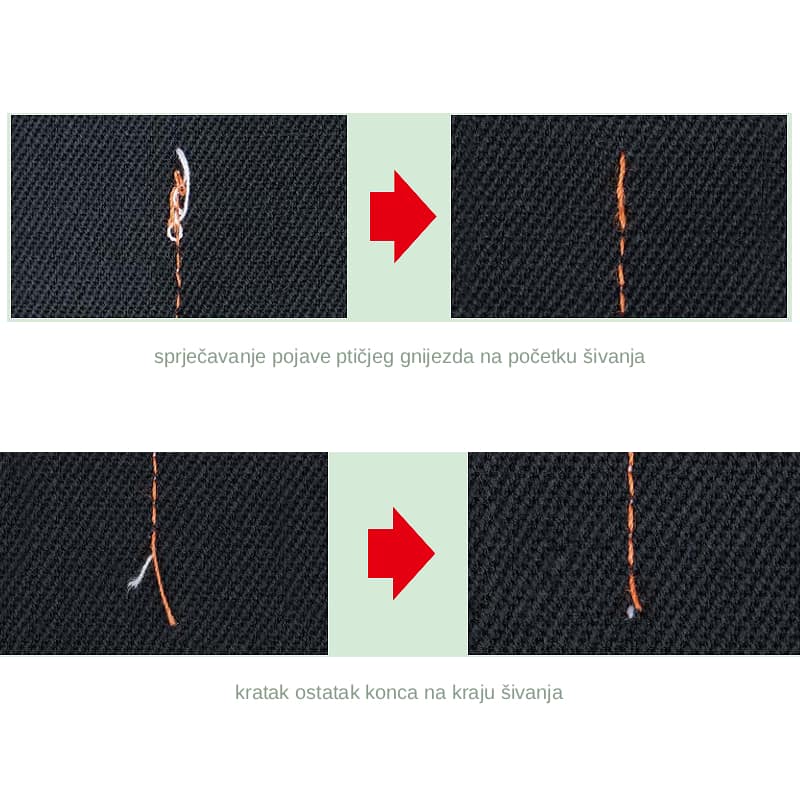 • Stroj počinje šivati koncem stegnutim i pridržanim jedinstvenom zračnom i kugličnom stezaljkom. Stoga obećani visokokvalitetni šavovi ne ostavljaju ptičja gnijezda (petljanje konca) na stražnjoj strani materijala.