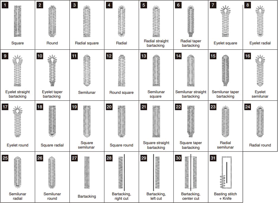 - Stroj je standardno opremljen s čak 31 uzorkom za šivanje rupica za gumbe.